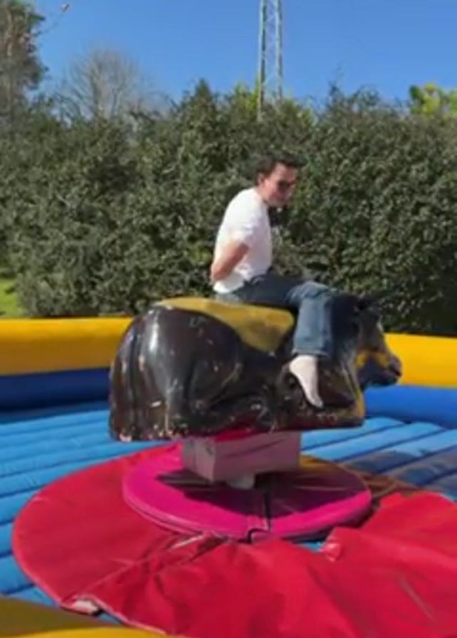 man riding a mechanical bull on an inflatable platform outdoors