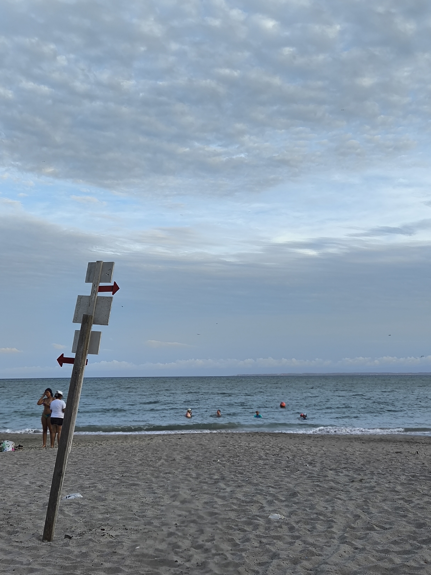 The image depicts a beach scene in El Yaque, Venezuela. The foreground is composed of dark gray sand, occupying approximately half of the image. A weathered wooden signpost stands to the left, displaying multiple white placards with red arrows pointing right. To the left of the signpost, two women are present. One wears a bikini and the other a white t-shirt with black shorts. The sea is visible in the midground, with several individuals swimming and one orange buoy is visible in the water. The background consists of a skyline of land and a cloudy sky. The sky dominates the upper half of the image, displaying a mix of light blue and gray clouds.