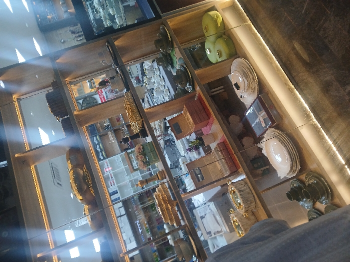- "The image depicts an interior view of a retail establishment, specifically a section showcasing home goods and tableware within illuminated glass-fronted wooden display cases" by FM-eUoRp2, licensed under CC BY 4.0