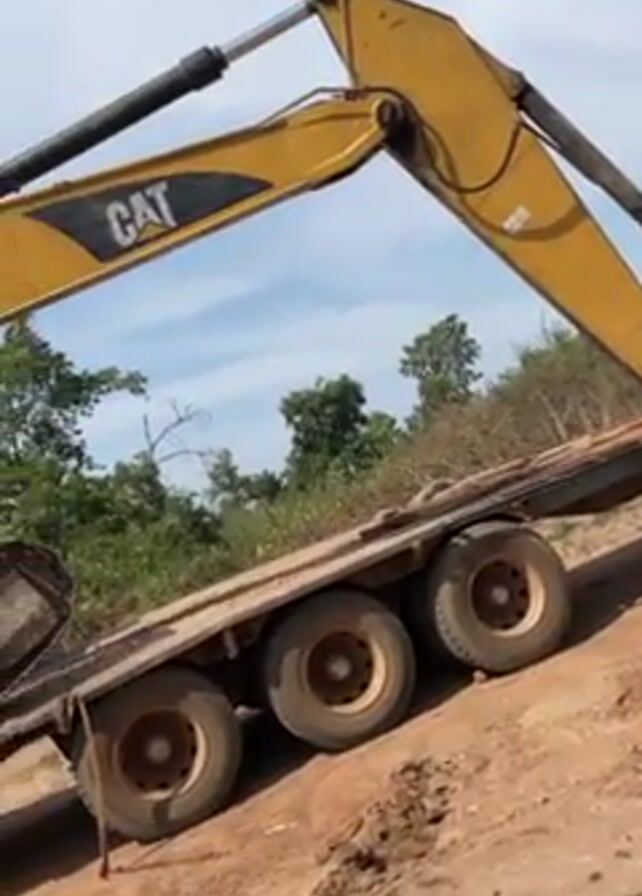 A yellow CAT excavator mounts a flatbed trailer on a dirt lot