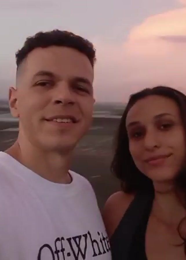 A couple is taking a selfie at a beach. The man is wearing a white t-shirt with the words "Off-White" written on it. The woman is wearing a black tank top. The beach appears to be muddy and has puddles of water. In the background, there is construction equipment, including a crane and an excavator. There are a few other people in the background, including a child wearing a red shirt. The sky is a pale pink and gray color, suggesting it is either sunset or sunrise. The couple is smiling in the selfie. The woman rests her head affectionately on the man's shoulder.