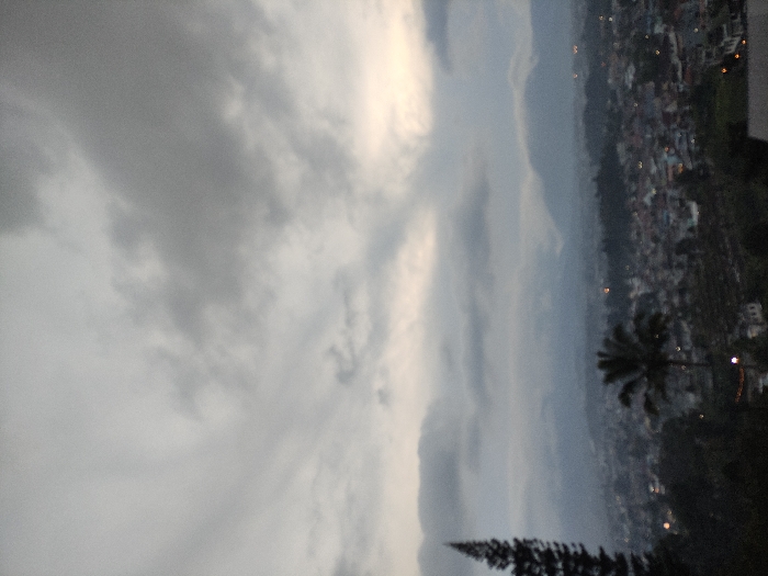 A wide-angle, blurred image depicts an elevated view of an urban area beneath a heavily overcast sky at twilight. The upper two-thirds of the frame are filled with dense, dark gray clouds, exhibiting minor illumination near the horizon on the right. In the lower left foreground, a tall, dark conifer tree is partially visible. Centrally positioned in the mid-ground, a solitary palm tree with distinct fronds is silhouetted against the city lights. The urban landscape below features a multitude of structures with numerous small, scattered yellow and orange artificial lights indicating habitation and infrastructure. Distant hills or mountains, shrouded in haze, form the background. No individuals, specific actions, or interactions are discernible. The presence of a prominent palm tree is inconsistent with the typical natural vegetation found in Nieste, Germany.