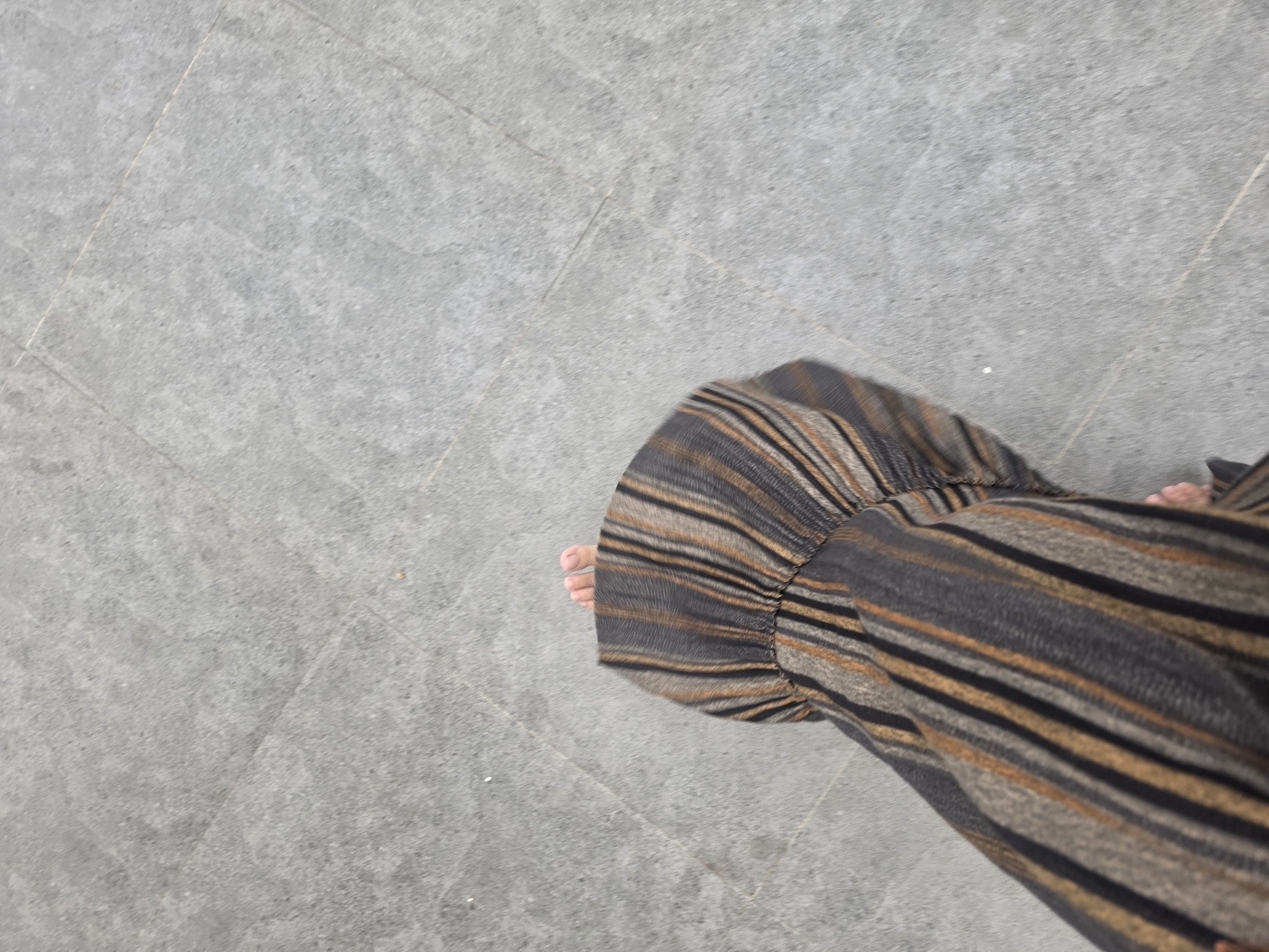 An individual's lower legs and bare feet are observed from an overhead perspective on a light grey paved surface in Blangmetimu, Indonesia. The subject wears a garment with vertical stripes in black, grey, and brown-orange tones, featuring a gathered design around the right ankle. The right foot is partially visible at the upper center, with toes showing. A small portion of the left foot is visible at the bottom left. The ground consists of large, light grey, textured paving stones or concrete, exhibiting faint, irregular joint lines.