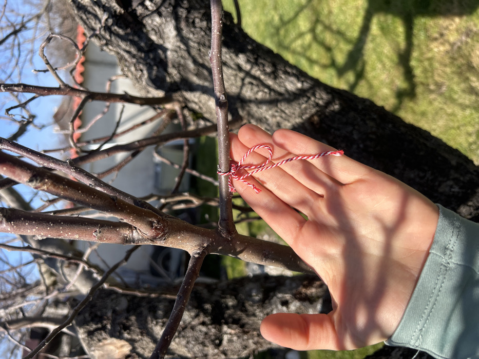The image captures an outdoor scene in Krupnik, Bulgaria, during daylight hours. A light-skinned human hand, wearing a light green long-sleeved garment on the wrist, is positioned palm-upwards in the lower portion of the frame. Directly above the hand, a traditional Bulgarian martenitsa, composed of red and white twisted string, is tied in a small knot around a slender, bare deciduous tree branch. The martenitsa hangs loosely towards the hand. The tree exhibits multiple leafless brown branches and a textured trunk, indicative of late winter or early spring. Sunlight casts distinct shadows from the tree branches onto the hand and the green grass on the ground below. In the blurred background, a building with a terracotta-tiled roof and light-colored walls is visible beneath a clear blue sky.