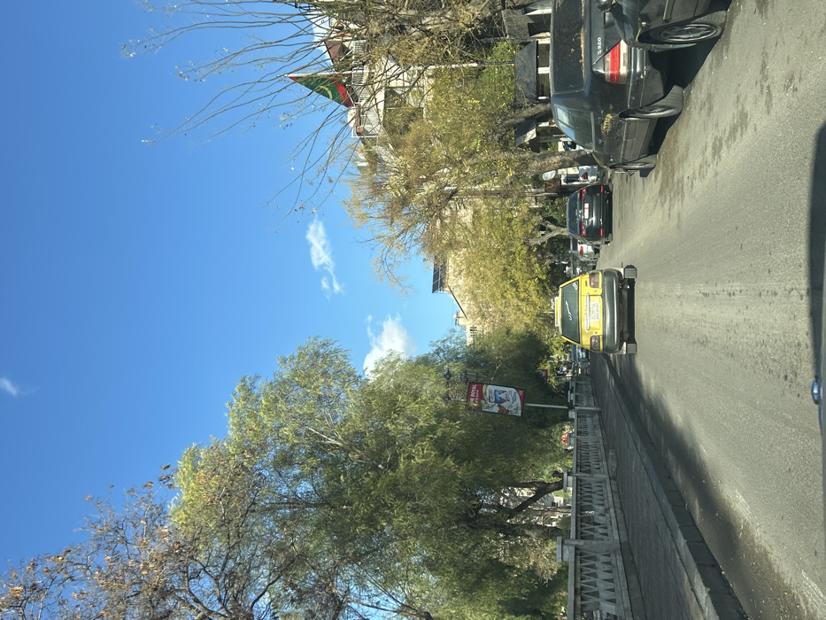The image presents a daytime street scene within Al-Muhajerin Municipality, Damascus, Syria. The perspective is from inside a vehicle, looking straight down a paved, two-lane road with visible wet patches. In the immediate foreground, the asphalt road occupies the lower portion of the frame. A yellow sedan taxi with Arabic script on its rear window is positioned centrally in the left lane, facing away from the viewer. Behind it, a black sedan is visible, followed by other vehicles in the distance. On the right side of the road, a black Mercedes-Benz S320 sedan is parked parallel to the curb, facing away, with other parked vehicles extending behind it. To the left of the road, a light-colored, ornate concrete or stone barrier delineates the edge of the street, behind which dense green foliage of various trees is present. A red and white banner, partially obscured by trees and displaying "THE ROYAL," is affixed to a pole on this side of the street. Some trees exhibit autumnal colors or bare branches. To the right of the road, trees with varying foliage line the street, behind which multi-story buildings are visible. One building prominently features balconies and a flag displaying horizontal red, green, and yellow stripes. Solar panels are observed on the rooftops of some buildings in the background. The sky is clear blue with scattered white clouds. No individuals are distinctly visible.