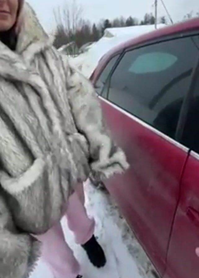 A woman wearing a gray faux fur coat, a light pink hooded sweatshirt, light pink sweatpants, and black shoes opens the rear door of a red hatchback in the snow. The woman has fair skin and brown hair, and she is wearing a light gray beanie. The car is parked in the snow next to a snow-covered path. There are trees and a snow-covered building in the background. A person’s hand, presumably the videographer, helps to open the door to the car. The videographer is wearing a wedding ring. It is a winter scene and the ground is covered in snow. The sky is overcast and gray.