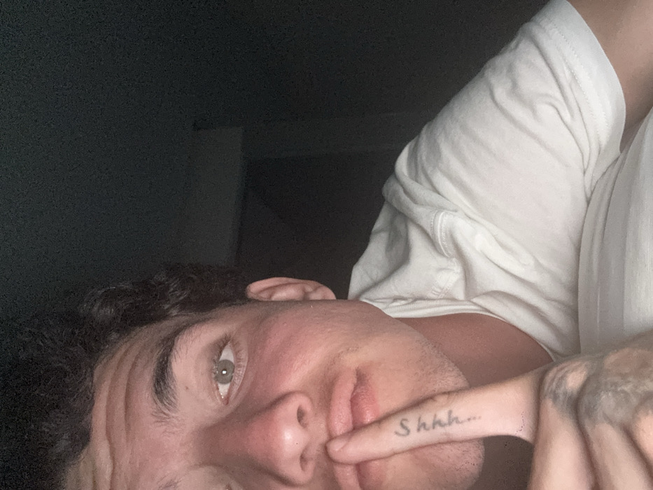 A man reclines in dim lighting, a white t-shirt visible. His face is close to the camera, featuring dark curly hair, prominent eyebrows, and light-colored eyes. His finger is placed over his lips, with the word "Shhh..." tattooed on it. Part of his arm and hand with another tattoo are visible on the right. The background is mostly dark, but there is a glimpse of a wall.