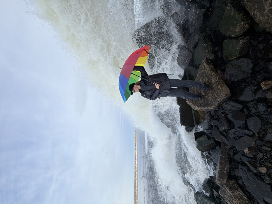 The image displays a female subject standing on a prominent, light-colored rock amidst a rocky shoreline in Chernushka, Russia. She is positioned facing left of the frame, holding an open, multi-colored (rainbow) umbrella with her right hand above her head. The subject is wearing a black puffer jacket, dark grey sweater, dark grey trousers, dark footwear, and a black cap. To her left and behind her, turbulent water is depicted crashing against the dark rocks, generating a substantial white spray that rises high into the air, partially obscuring the background on the right. A calmer body of water extends into the distance, with a faint, low landmass visible on the horizon under an overcast sky.