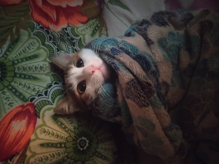 - "A domestic cat is depicted in a close-up, chest-up view, wrapped in a plush, patterned blanket" by FM-mcF8x2, licensed under CC BY 4.0