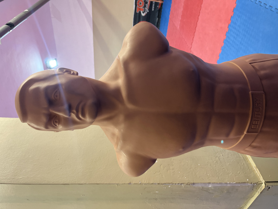 - "The image presents a brown, male-torso training dummy, branded "CENTURY" on its waist, positioned upright in an indoor martial arts or combat sports training facility" by FM-DGfKG3, licensed under CC BY 4.0