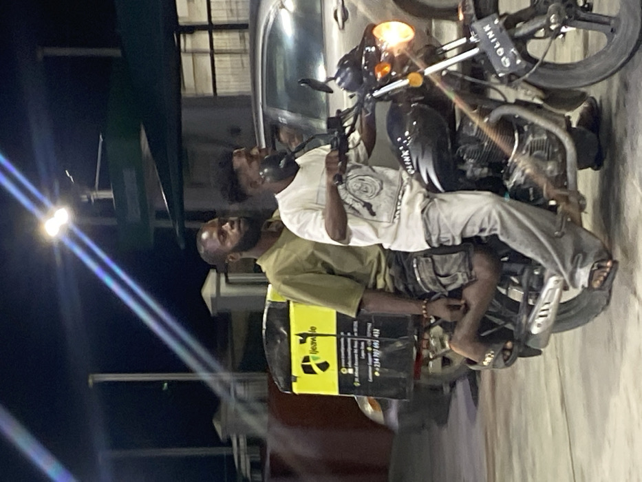 A nighttime scene in Ikate, Nigeria, depicts two males on a black QLINK motorcycle