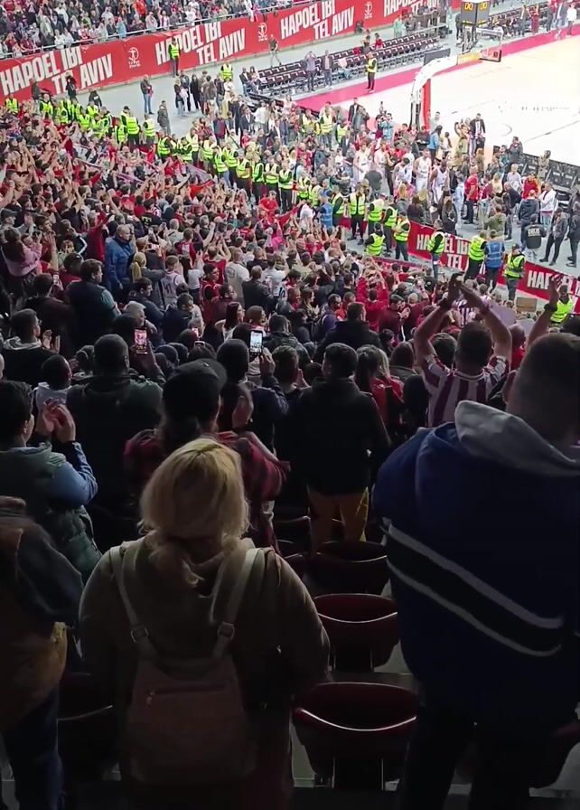 The video captures a crowded indoor sporting event, likely a basketball game, where spectators fill the stands, many standing and cheering. The primary focus is on a section of the audience, viewed from behind, as they celebrate, raise their arms, and record the event with their smartphones. The environment is vibrant, marked by a sea of people and the red and white colors of Hapoel Tel Aviv prominently displayed on banners and attire. Security personnel in yellow vests are visible near the court. The atmosphere is energetic, with people actively engaged in the game's excitement.