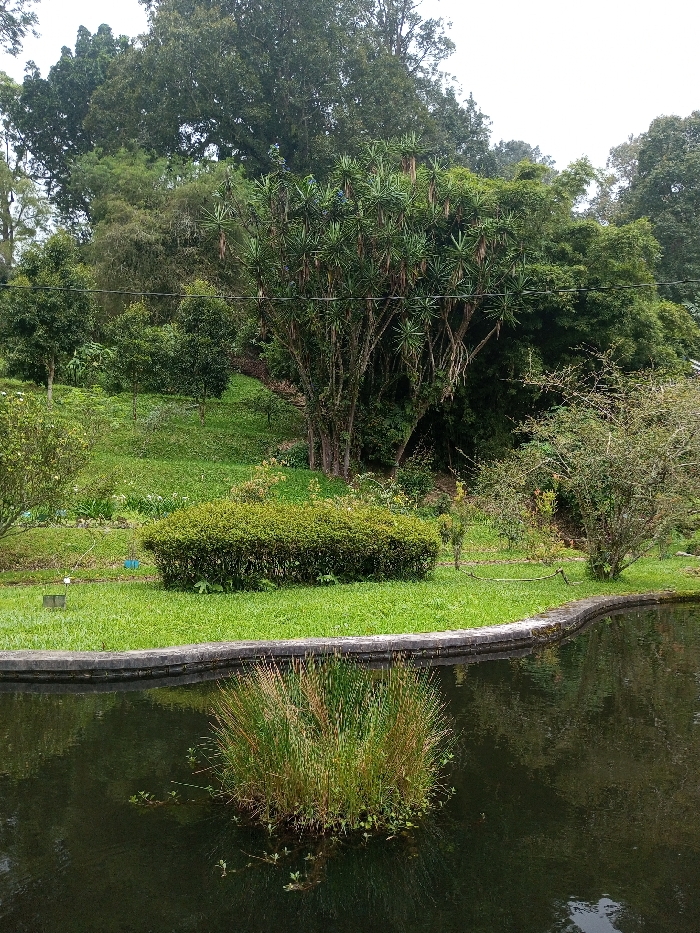 A serene scene features a still pond reflecting surrounding greenery. A tuft of tall grass grows in the water, creating a focal point. The pond is bordered by a stone edge and lush, manicured lawn. A neatly trimmed hedge sits atop the bank. Beyond, a gentle, grassy slope ascends towards a dense collection of trees, suggesting a tranquil and well-maintained garden or park setting.
