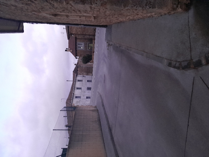 This image depicts a deserted street corner within a village or town, identified as Montorio, Spain, under an overcast sky. The foreground features a dark grey asphalt road that curves slightly to the left, with visible light grey concrete sidewalks on both sides. The sidewalk on the left is bordered by a low concrete wall, beyond which a chain-link fence with dark poles is erected. Several buildings are visible in the mid-ground and background. On the left side, behind the fence, a two-story building with a light-colored, possibly off-white, facade and dark-framed windows is prominent. Further back, another building with a tiled roof is partially visible. On the right side of the frame, a textured stone building occupies the immediate foreground, with part of its dark roof overhang extending into the upper right corner. A rectangular window opening is visible on this building's wall. In the center-background, an intersection is visible, bordered by a mix of residential structures. One building has a reddish-brown tiled roof with two chimneys and a lit window on the ground floor, suggesting artificial interior illumination. A small, dark-leafed tree or shrub stands near this building. Another lighter-colored building with multiple windows is also present in the background. No individuals or vehicles are present. The lighting is low and diffuse, consistent with an overcast day or twilight hours.
