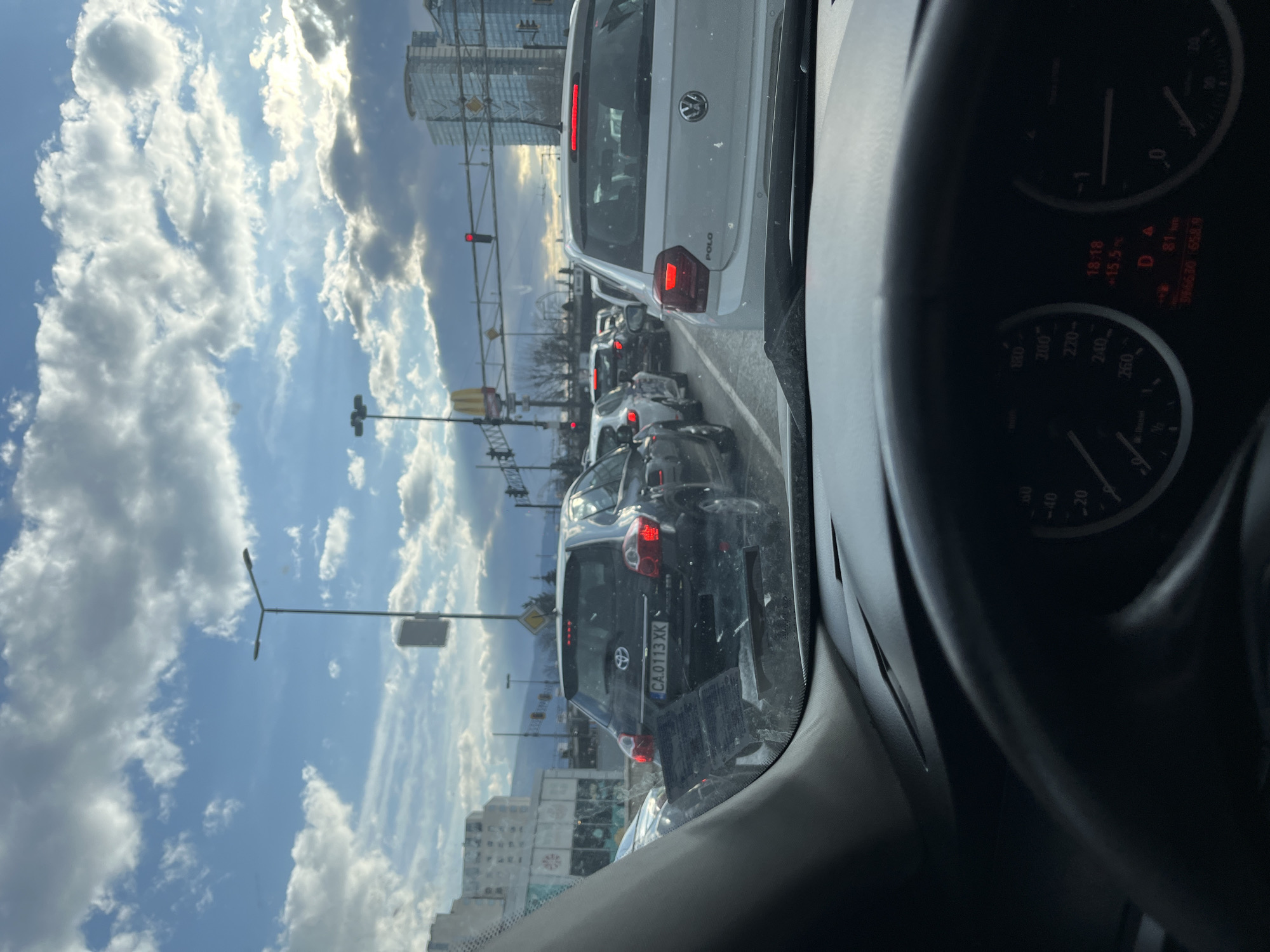 The image depicts a vehicular perspective from inside a car stopped in heavy traffic on Bulgaria Blvd, Sofia, Bulgaria, heading south towards the intersection with Cherni Vrah Blvd. The time displayed on the dashboard is 18:18, with an ambient temperature of 15.5 degrees Celsius, the vehicle in "D" (Drive), and a reported mileage of 396630 km. In the immediate foreground, the top of a black steering wheel and parts of the dashboard are visible, with the vehicle's speedometer indicating zero. The windshield is partially obscured by minor debris and what appears to be a sticker or residue on the lower-left. Directly ahead, a dark grey Toyota hatchback (license plate "CA 0113 XK," indicating Sofia, Bulgaria) is stationary, with its brake lights illuminated. Behind the Toyota, another vehicle is partially visible. Immediately to the right of the Toyota is a white Volkswagen Polo hatchback, also stationary, with its brake lights on. The line of traffic extends into the distance. In the mid-ground, a multi-lane road is visible, regulated by an overhead gantry supporting traffic lights, one of which displays a red signal. A yellow diamond-shaped priority road sign is visible to the right of the Toyota. Further in the distance, a large red McDonald's logo is clearly identifiable. The background features the urban landscape of Sofia under a partly cloudy sky with patches of blue and diffused sunlight. Prominently on the right side of the road, a large, modern, multi-story glass building with a distinctive patterned facade is visible (identified as the Millennium Center complex). Other less distinct urban buildings line the street. In the far distance, a mountain range, consistent with Vitosha, is visible against the horizon.