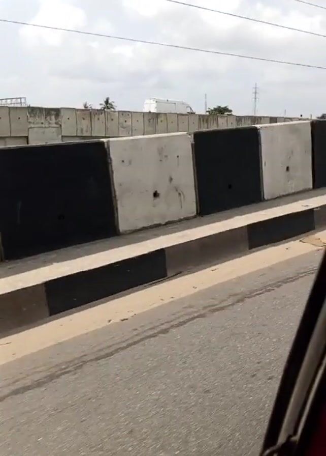 person driving a red van on a paved road with a concrete barrier on the side. The barrier is painted with black and grey squares, and there are some utility poles and trees in the distance. The driver is wearing a blue shirt. The interior of the van is worn and shows signs of use. The dashboard and steering wheel are visible, and the driver is holding the steering wheel with both hands. The camera is inside the van, capturing the view from the passenger seat.