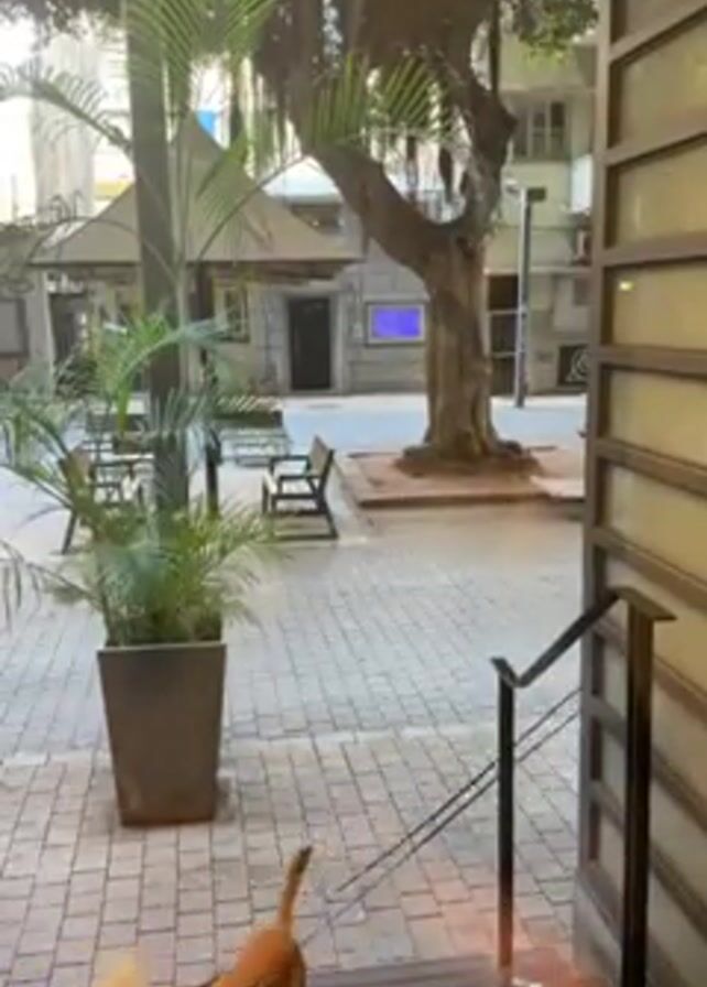 A man walks down outdoor steps, leading two dogs on leashes. The dogs are a white, small breed dog and a short-haired, brown dog. A large potted plant sits on the left side of the frame. Outside, the scene appears to be an outdoor courtyard with trees, benches, and cobblestone paving. The camera is positioned indoors, looking out through a doorway.
