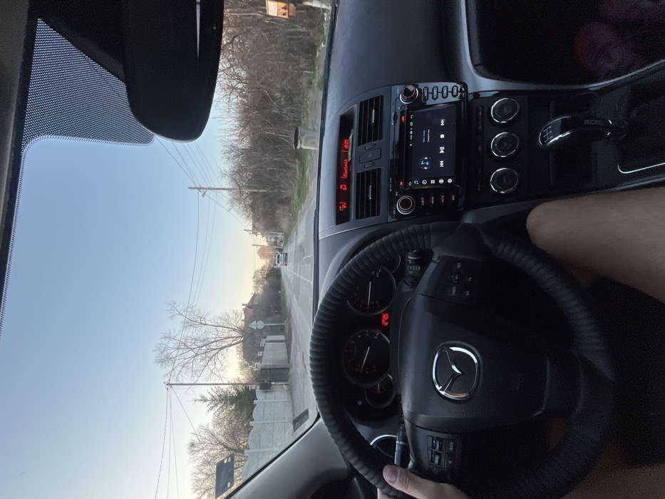 The image depicts the interior of a vehicle, specifically a Mazda, from the driver's perspective, looking forward through the windshield