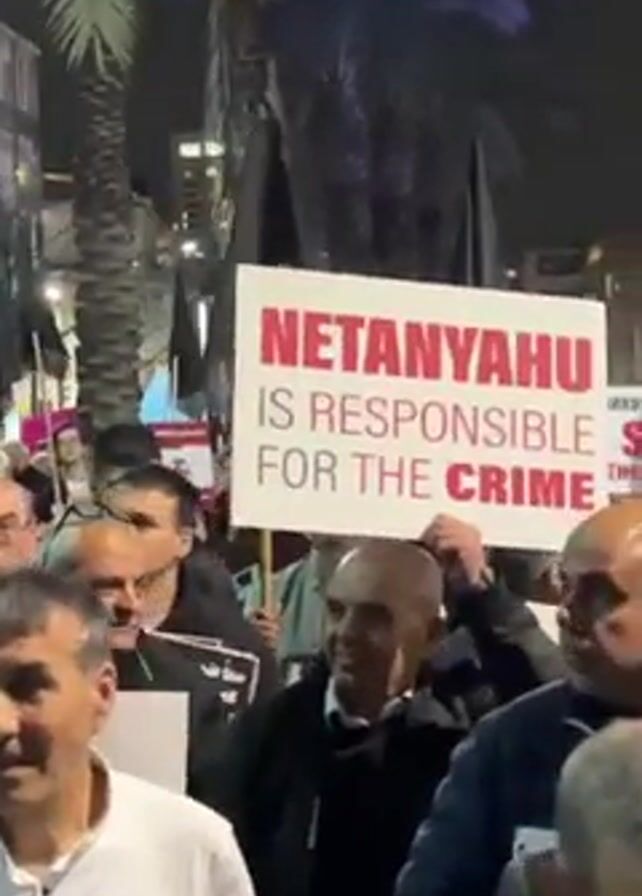 A crowd of people are marching in the street at night. Many of them hold signs that read, "NETANYAHU IS RESPONSIBLE FOR THE CRIME." The crowd appears to be diverse in age and gender. Palm trees and buildings are visible in the background.