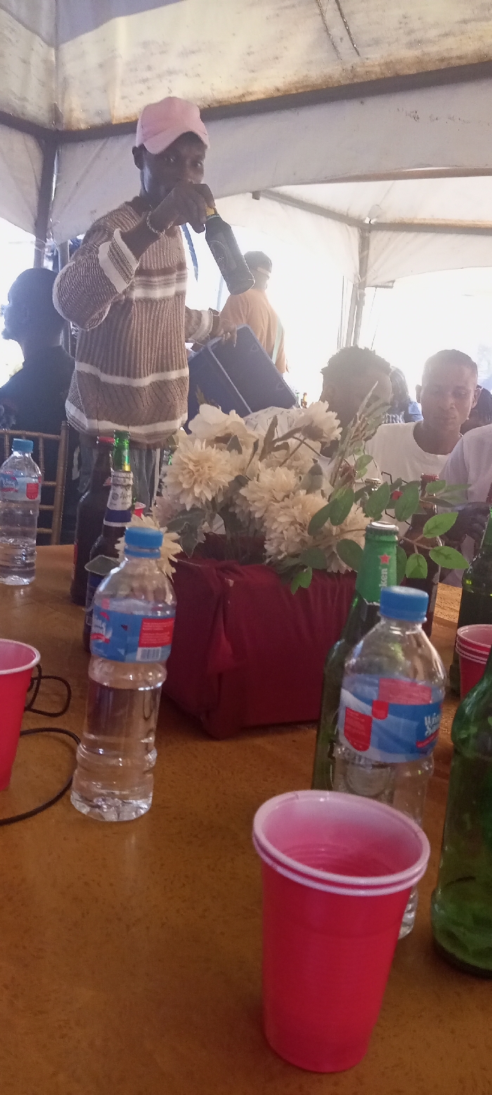 The scene depicts a social gathering occurring under a white fabric canopy or tent structure in the city of Nnewi, Nigeria. A dark-skinned male, wearing a pink baseball cap and a brown and off-white striped long-sleeved sweater, stands in the central foreground, actively drinking from a dark glass bottle, holding it to his mouth with both hands. He is positioned near a light-brown wooden table that extends into the foreground. On the table, several items are present: multiple plastic water bottles with blue caps (some partially full), numerous empty or partially consumed green and dark brown glass beverage bottles (one identifiable as Heineken), and at least three red plastic cups. A floral centerpiece with light-colored artificial flowers and green foliage, housed in a dark red wrapped container, is centrally placed on the table. A black electrical cord lies on the table surface in the lower left. In the background, other individuals are visible: a person with dark hair seen from behind to the left, a person in an orange-brown shirt partially obscured behind the central figure, and at least two other males seated at the table to the right, one wearing a white t-shirt. The lighting appears bright, suggesting an outdoor or semi-outdoor daytime event.