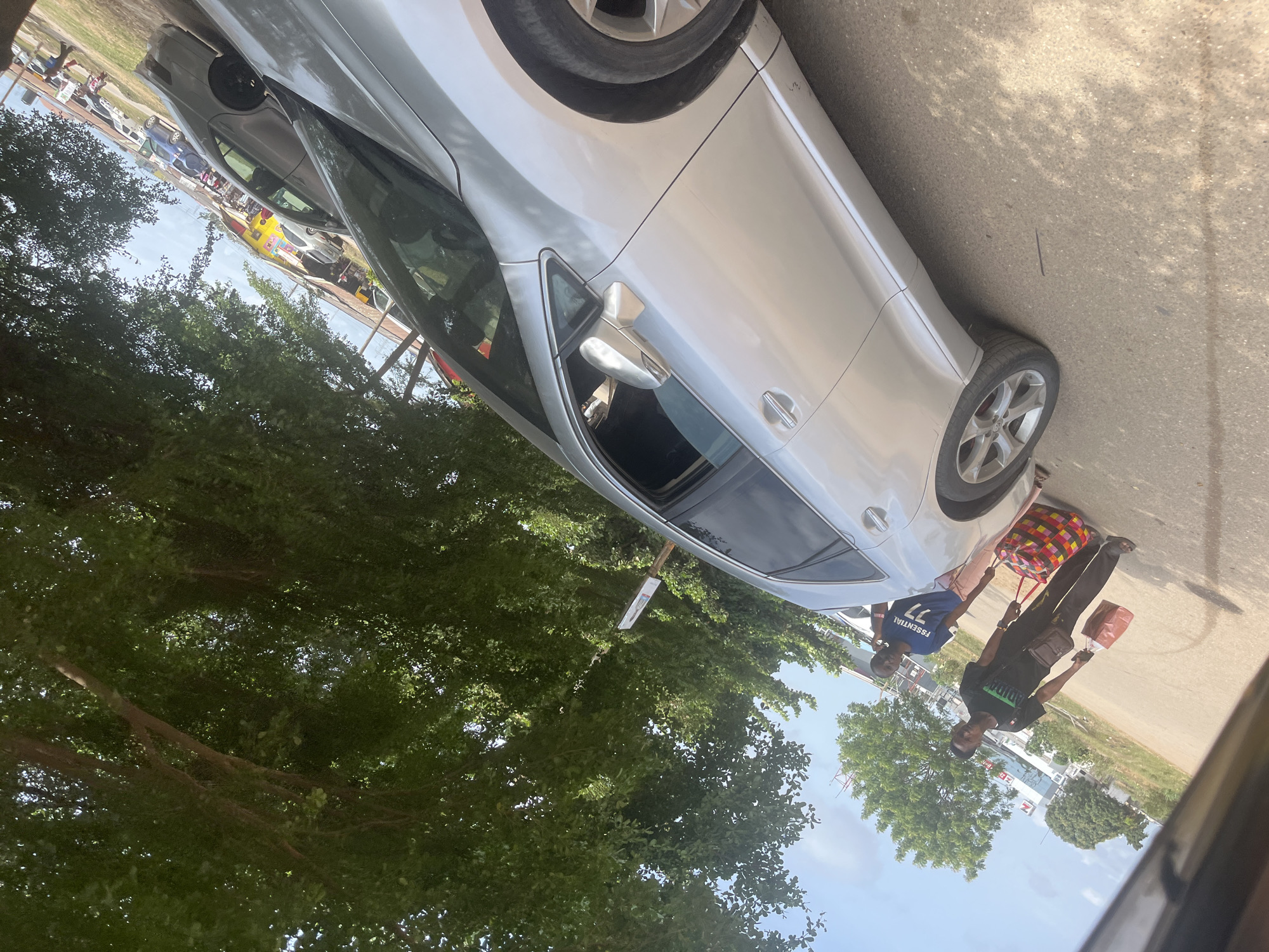 The image depicts a tilted daytime street scene in an urban area of Lagos, Nigeria, likely near the Apapa port district. In the midground, a silver Toyota Venza SUV is prominently positioned, displaying its passenger side. The vehicle exhibits minor scuff marks along its lower body. Adjacent to the Venza, on a paved road, stand two adult males. The male closer to the camera wears a black t-shirt with green lettering, dark trousers, and sandals, carrying a small brown paper bag in his left hand and a dark shoulder bag. The second male, positioned slightly behind and to the right, wears a blue t-shirt with "ESSENTIAL 77" in white, light-colored trousers, and holds a large, multicolored checkered bag. Both individuals have dark complexions and short dark hair; they appear to be walking. The immediate foreground, at the bottom-left, shows a dark, indistinct object, suggesting the photograph was taken from within a vehicle. Overhead, a dense canopy of green trees covers the upper portion of the frame. In the background, beyond the paved road, various structures are visible, including a building with a bright yellow facade and a larger, predominantly white building with red accents in the distance, consistent with commercial or industrial facilities found near a port, such as Apapa Wharf. Other vehicles are visible further down the road, and the sky is clear blue.