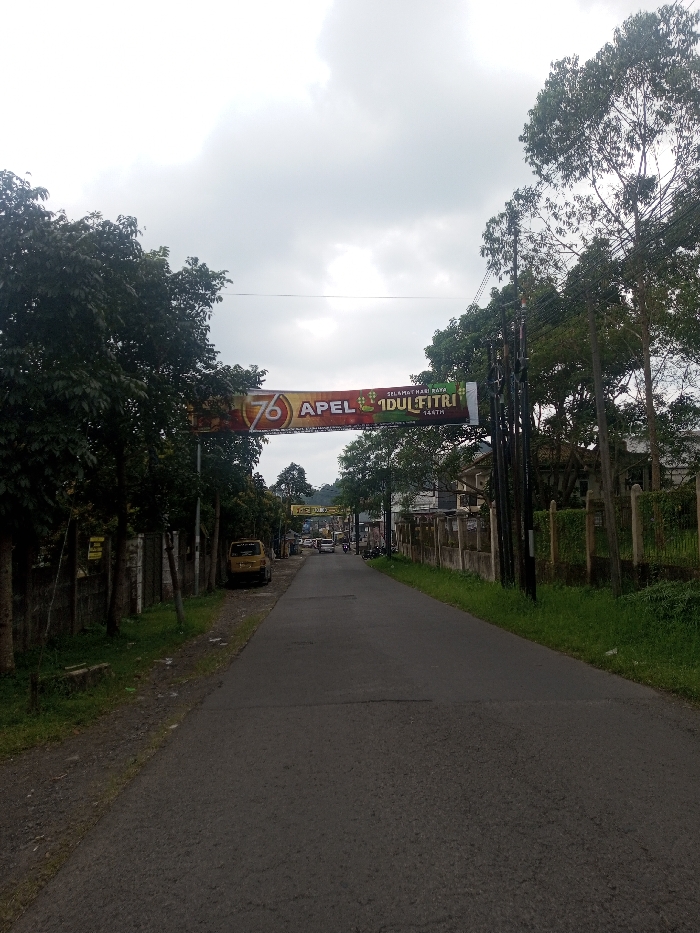 The image displays a paved, two-lane road in a semi-urban or residential setting, observed under an overcast sky. A prominent, multicolored banner is strung horizontally across the road, displaying the text "SELAMAT HARI RAYA IDUL FITRI 1447H" and "76 APEL" in Indonesian or Malay, indicating a celebration or commemoration. This textual evidence suggests a location within an Indonesian or Malay-speaking region, which differs from Kalchini, India. On the left side of the road, dense green trees and a concrete wall or fence line the perimeter. A light yellow van or small SUV is parked parallel to the road, partially obscured by foliage and a low concrete structure. On the right side, multiple dark utility poles with numerous overhead wires run parallel to the road, accompanied by green grassy verges and a concrete fence with metal grating. Further down the road, more trees and residential buildings are partially visible behind the fences on both sides. Several indistinct vehicles, including cars and at least one motorcycle, are visible in the distant stretch of the road. No individuals are clearly identifiable within the scene.