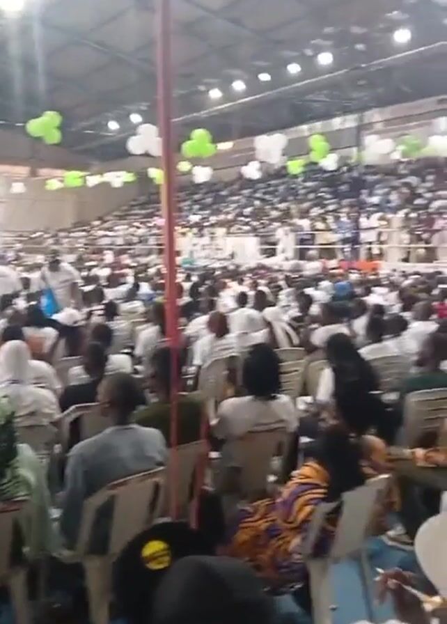 large indoor event space with a large crowd of people seated in rows of chairs. Many people are wearing white shirts with possible text on the back. There is a raised stage at the front of the room with lights and screens. White and green balloons decorate the ceiling. The camera moves slowly across the room.