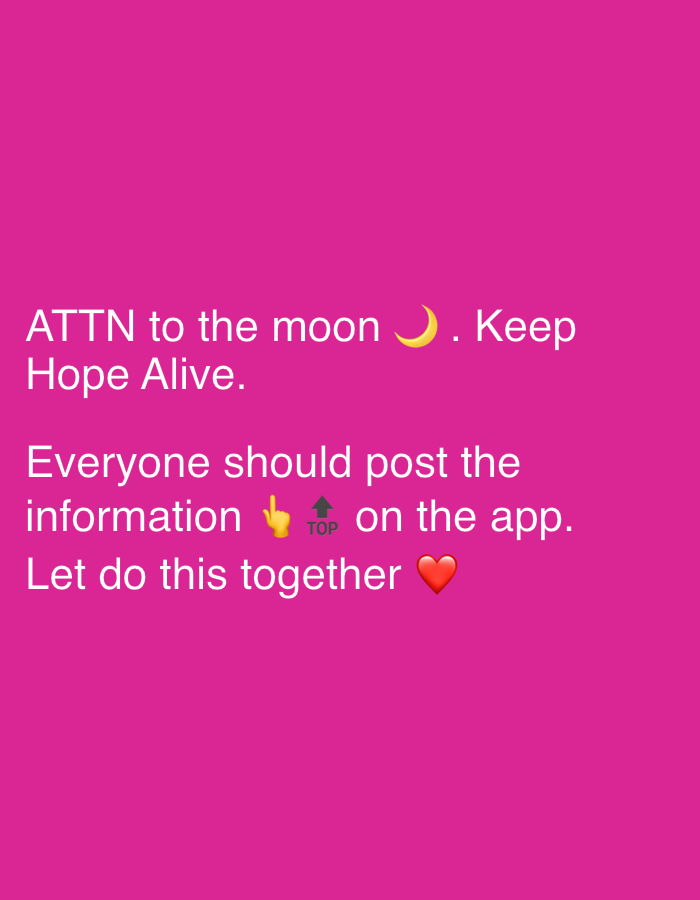 A pink square with white text encourages collective action and hope. "ATTN to the moon 🌙. Keep Hope Alive." is followed by a call to action: "Everyone should post the information 👆 on the app. Let do this together ❤️". The message uses emojis to convey emotion and emphasize the call to post information.