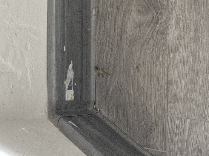 The image depicts an indoor scene in a building located in the city of Mechkarevo, Bulgaria. A small, light brown lizard, approximately 5-7 cm in length, is situated on a light gray wood-effect laminate floor. The lizard is positioned parallel to and a few centimeters away from a dark gray skirting board that runs along the base of a light-colored, textured wall. The skirting board exhibits some peeling paper residue or adhesive near its upper edge. The corner where two walls meet, joined by the skirting board, is visible on the left side of the frame. No individuals are present.