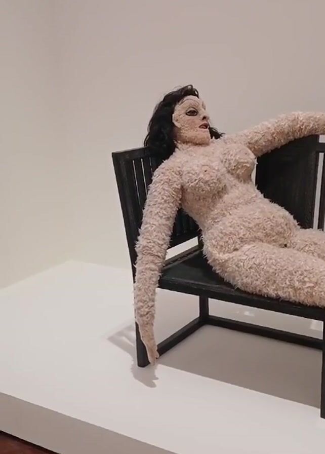 A video shows a sculpture of a nude woman lying on a dark-colored bench. The sculpture is mostly covered in a fuzzy, off-white material, except for its face and hair. The woman's face is painted, with black hair. The bench is positioned on a white platform in an art gallery. The backdrop is a plain, off-white wall. The camera slowly pans to the right.