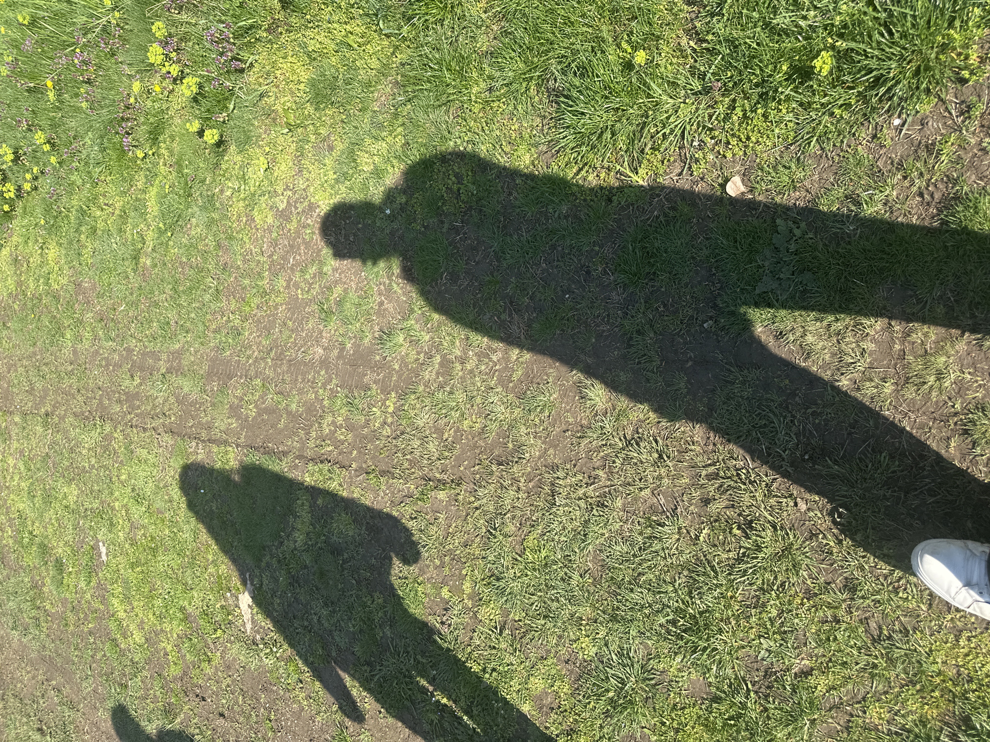 patch of grassy land, potentially a field or lawn. The grass is primarily green with some yellow flowers interspersed. Two shadows of individuals are visible on the grass, suggesting the presence of two people taking the picture. One shadow is elongated and shows the outline of a person's body. A white sneaker is partially visible in the right part of the image. The environment appears to be sunny. Arbanassi, Bulgaria, cannot be confirmed as the location using only the provided image.