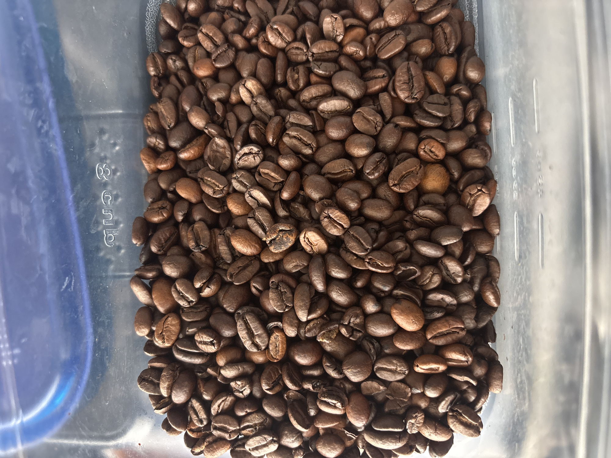 close-up of coffee beans in a clear plastic container