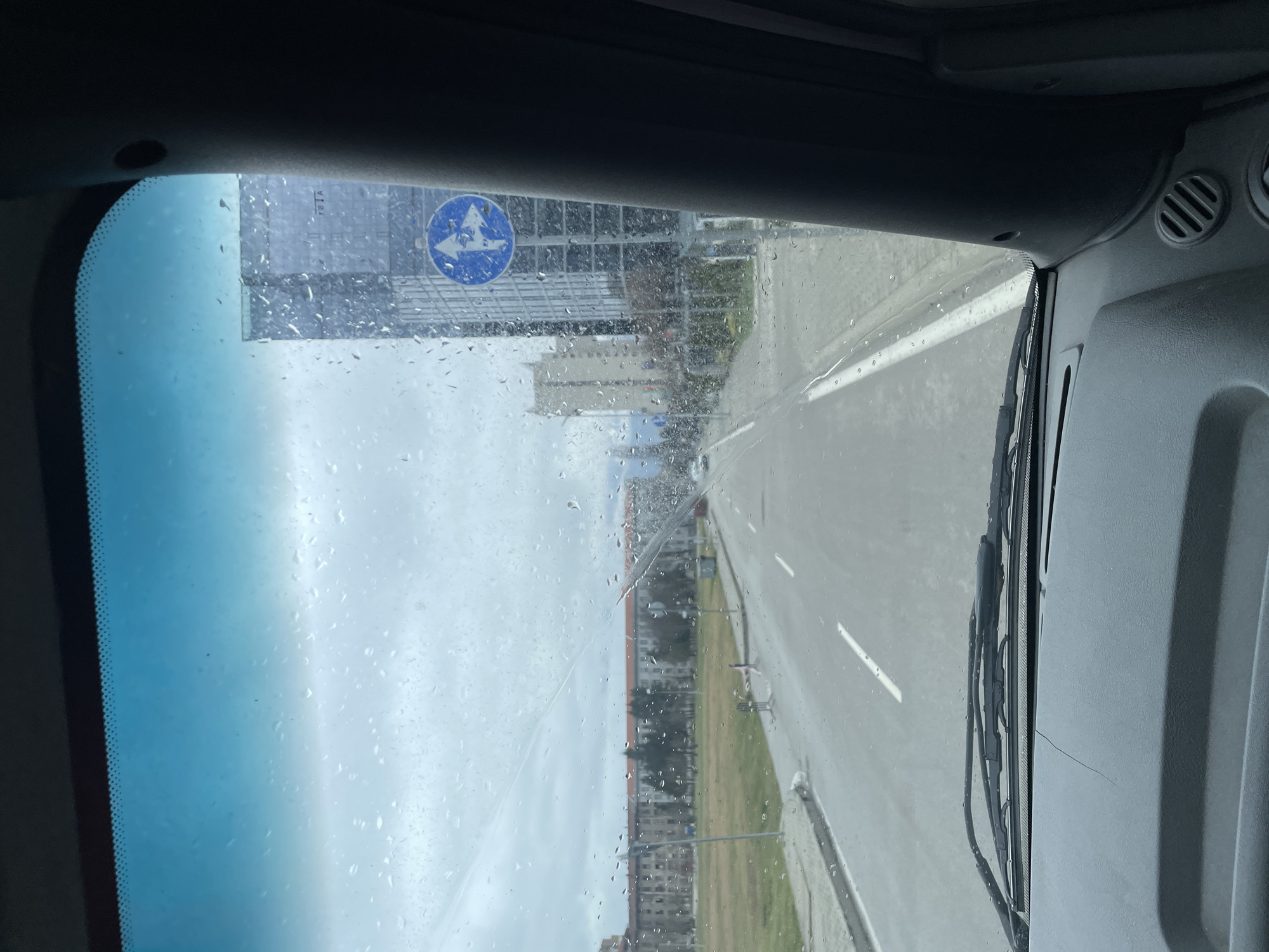 The image, taken from inside a vehicle, shows a road in Sofia, Bulgaria on a rainy day. The windshield is covered in water droplets, obscuring the view. A mandatory direction sign is visible on the side of the road near a modern building. The road has white lane markings. Buildings and greenery can be seen in the distance. A windshield wiper is visible on the right side of the windshield. The interior of the vehicle is visible, including the dashboard and air vents.
