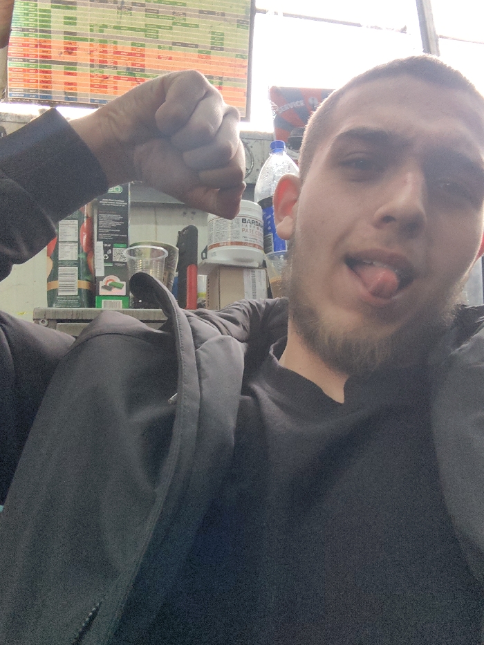 A young adult male, appearing in his late teens or early twenties, with a short haircut and a light beard, is captured in a head-and-shoulders, informal portrait. He is wearing a dark, possibly black, crew-neck shirt and an open dark jacket. His left arm is raised, with the hand clenched into a fist positioned above his head. He is looking directly at the camera, with his tongue extended slightly from his mouth. The scene is an interior environment, consistent with a small retail establishment, service shop, or storage area, located in Sofia, Bulgaria. In the upper background, a brightly lit screen or signboard displays a grid of information with green, orange, and white segments, possibly indicating prices, a schedule, or betting odds. Behind the subject, various items are visible on shelves or surfaces: a clear plastic cup with a dark liquid, a white tub labeled "BARDAL PATE," a blue plastic bottle, and an orange object partially displaying "SERVICE" text. Other packaged goods with labels are present on the left side of the frame. The lighting suggests an overhead light source or a window.
