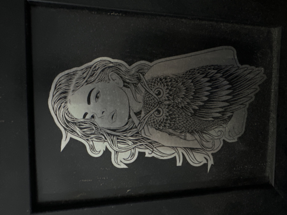 A black and white image of a woman with long hair and a large owl resting on her shoulder. The sticker is attached to a black surface that is heavily worn and covered in dust and dirt. The woman is looking to the left, out of the frame. The sticker is placed within a wooden frame on a black door. The image is located in the city of Thành phố Cam Ranh, Vietnam, at the coordinates 11.974, 109.187.