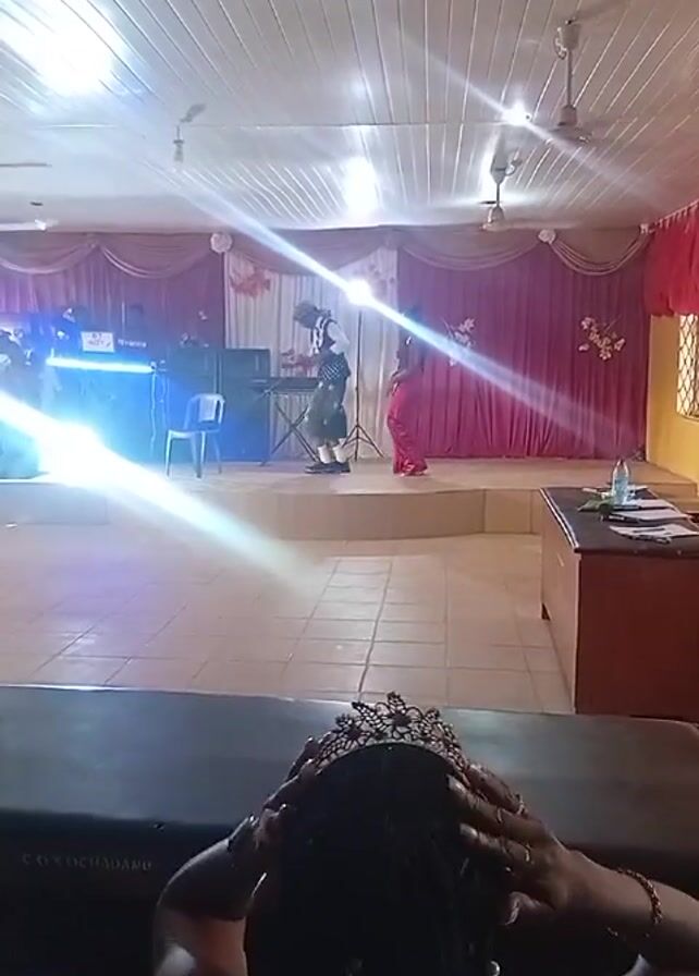 A person with a crown on their head is sitting in a room, watching a stage performance. The stage features red curtains and a musical ensemble. There's a man in a vest playing a keyboard, and a woman in a red dress dancing. A DJ booth with bright lights is on the left side of the stage. The room has a tiled floor and ceiling fans. There is a desk on the right side with various items, possibly papers and a bottle of water, on top.