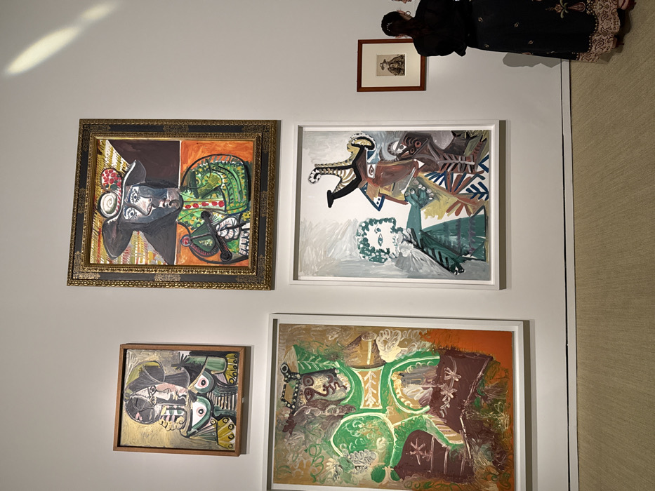 An interior view of an art gallery, identified as the Louvre Abu Dhabi, United Arab Emirates, displays five paintings mounted on a light-colored wall above a beige carpeted floor. Four large-scale paintings are centrally arranged. On the upper left, a cubist-style portrait of a figure in green, yellow, and black tones is enclosed within a light wooden frame. To its right, a larger painting, set in an ornate dark and gold frame, depicts a dark-faced figure wearing a wide hat and green patterned attire, holding an object, against an orange and yellow background. On the lower left, a large vertical painting features a stylized green and brown figure with elaborate headwear and chest elements. To its right, another large vertical painting showcases multiple abstract figures, including a light-skinned figure with curly hair and a complex, angular brown figure with an architectural headpiece. A small, framed portrait of a figure in a hat is positioned on the far right wall. Two individuals, appearing to be female, are partially visible on the right side of the frame, facing away from the camera and towards the smaller artwork. The foreground individual wears a dark long-sleeved top and a long, dark skirt with light-colored patterns along the hem. The background individual is partially obscured. The space is evenly illuminated, with a diagonal beam of light visible on the upper right wall.
