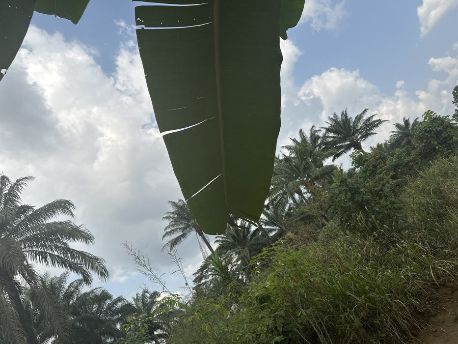 The image displays an upward-angled view of a lush tropical environment, consistent with areas in Uyo, Akwa Ibom State, Nigeria