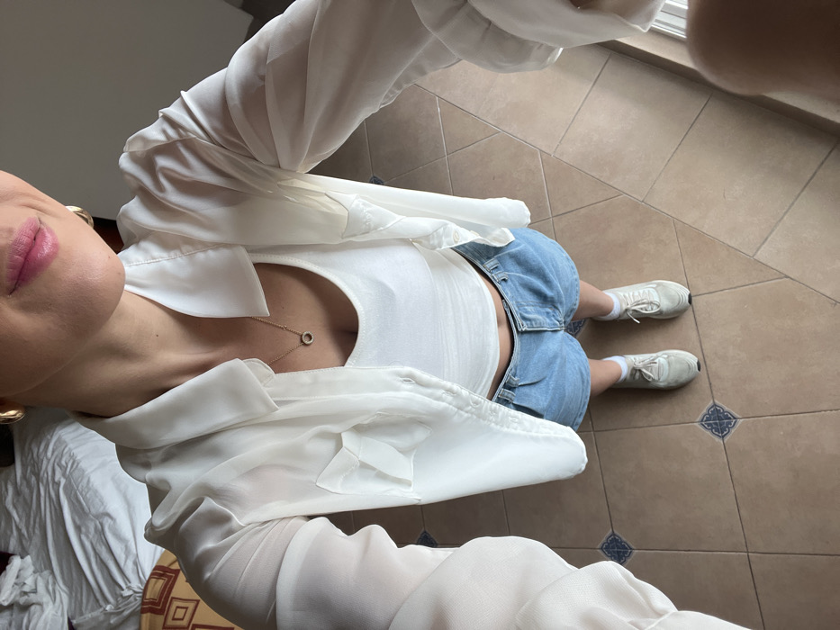 A single individual stands in an interior setting, likely a room in Chamilpa, Mexico, capturing a high-angle, downward-facing image of their attire. The person wears a white, ribbed tank top under an unbuttoned, sheer white long-sleeved shirt with a collar and a single left breast pocket. Light blue pleated denim shorts are worn on the lower body, exposing a portion of the abdomen. White socks and light-colored athletic shoes complete the ensemble. A gold-toned necklace with a small, circular, possibly jewel-encrusted pendant is visible on the chest, along with a gold hoop earring on the right side of the head. The subject's lips are coated with pink lipstick. The flooring consists of large, light brown square tiles interspersed with smaller dark blue and white patterned accent tiles at regular intervals. In the background to the left, a rumpled white bed with patterned bedding and a partial headboard is visible, indicating a bedroom.