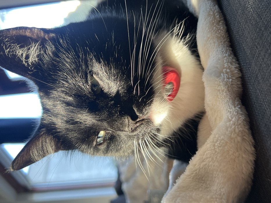 - "The image displays a close-up, eye-level perspective of a domestic cat, specifically a black and white tuxedo, resting indoors" by FM-XA2Is1, licensed under CC BY 4.0