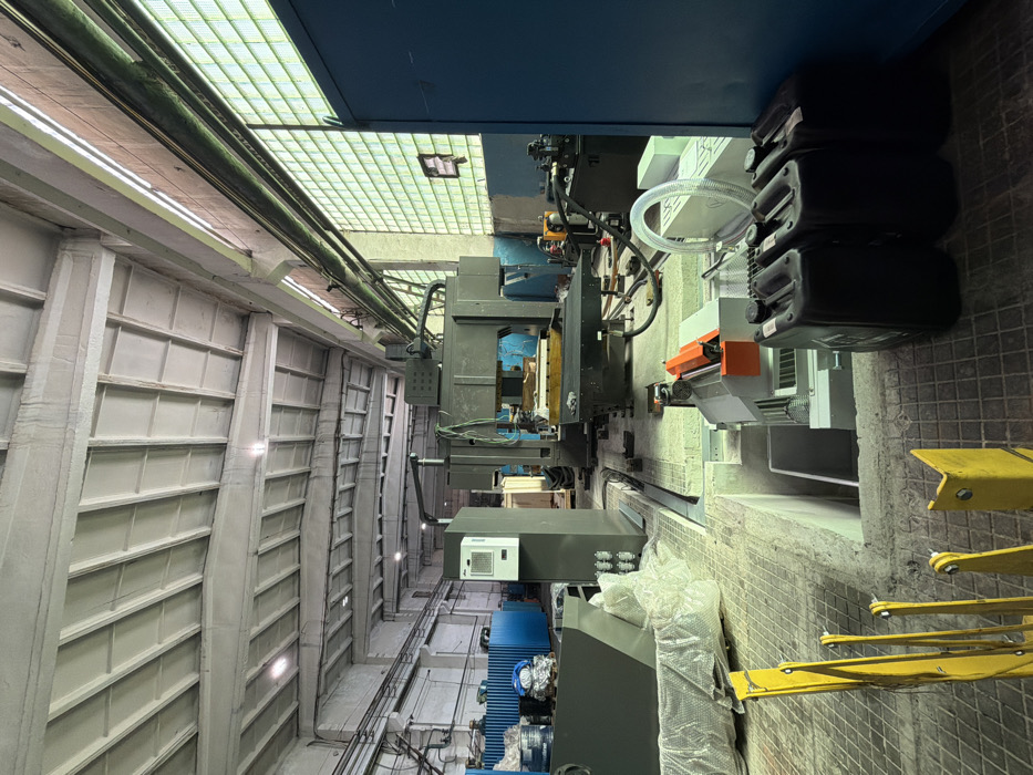 The scene depicts the interior of an industrial workshop or factory floor in Mahilyow, Belarus. The facility features a high, light-colored concrete ribbed ceiling supported by beams, fitted with overhead fluorescent lighting fixtures. The walls are primarily light-colored concrete or block, with a horizontal blue stripe or wainscoting along the lower section. A significant portion of the right-hand wall consists of large, textured or frosted glass block windows, admitting natural light. The concrete floor displays variations in texture and color, with a rectangular pit visible in the foreground. Several industrial machines are present. In the mid-ground, a large, dark grey industrial machine, possibly a CNC milling machine, stands with a light-colored workpiece on its table. A tall, light-grey control cabinet with a white interface unit is positioned adjacent to this machine on the left. Further into the background on the left, additional machinery and blue industrial containers are partially visible. To the right of the central machine, another large piece of industrial equipment is situated. In the foreground, positioned over the floor pit, is a smaller industrial machine with white and orange components, possibly a saw or cutting station. Three black plastic jerrycans are placed on the floor to the right of the pit, next to a tall, blue metal enclosure or cabinet. Yellow metal safety barriers or equipment parts are visible in the immediate foreground, near the pit's edge. No individuals are present in the image. The environment appears operational, displaying typical signs of an active industrial setting.