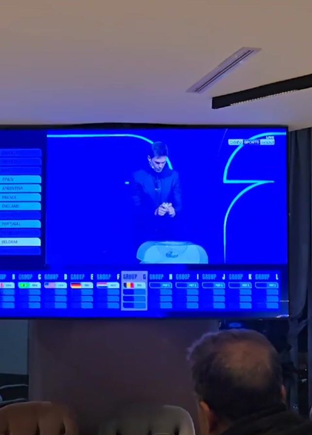 A middle-aged man with receding gray hair is watching a large TV screen on the wall. The screen displays a live sports broadcast from beIN Sports. The broadcast appears to be a draw for a sports competition, perhaps a World Cup or similar event. On the screen, a man in a suit is holding up a strip of paper with "SPAIN" printed on it. The screen displays a table with various country names in different groups; Belgium is already in Group G. The man watching the screen is seated at a small table, in what seems like a public space such as a lounge or a restaurant. Two armchairs are on either side of him, and part of a window is visible to the right.