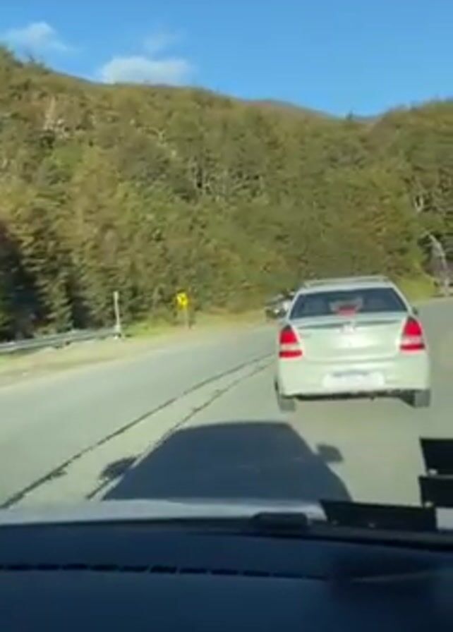 The video begins inside a moving car, showing a road ahead with a car in front, trees on either side, and a blue sky above