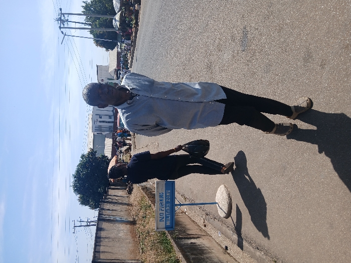 The image captures an outdoor urban scene under bright daylight. In the immediate foreground, a dark-skinned male, appearing in his 40s or 50s, stands facing slightly left of the camera. He wears a light grey long-sleeved collared shirt, black trousers, and light brown clogs, with his hands clasped behind his back. To his left, a second individual, dressed in a dark shirt and dark trousers, walks away from the camera, carrying a black handbag in their right hand. On the left side of the frame, a concrete wall runs parallel to the asphalt road. Adjacent to the wall, a blue and white sign on a concrete base clearly states "NO PARKING MILITARY ZONE." Dry vegetation is visible behind the sign and wall. In the background, on the right side of the road, there is a lively street market featuring numerous individuals, canopies, and stalls. Utility poles with multiple overhead power lines are present on the right. Further in the distance, a multi-story white building with visible windows is situated. The bright sun casts long, distinct shadows of the subjects onto the asphalt road. The scene is consistent with a public street in Jos, Nigeria, in an area designated as a military zone.