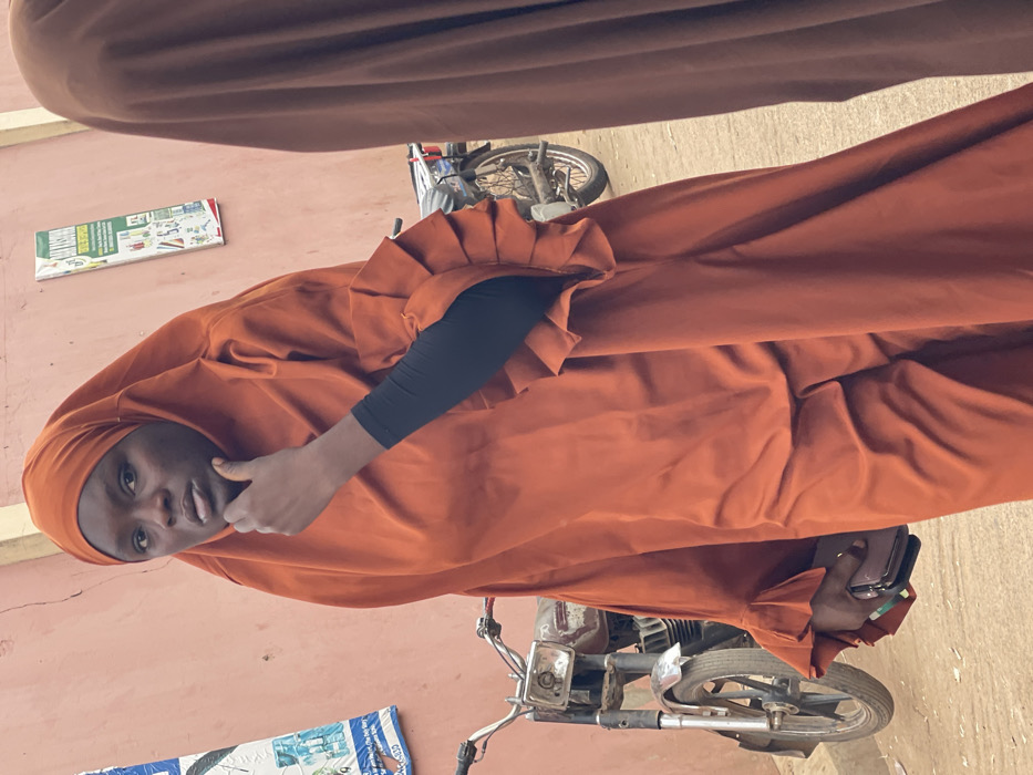 The image depicts an outdoor scene in Samaru, Nigeria. A young adult female with dark skin, wearing a rust-colored abaya with ruffled sleeves and a matching hijab, stands centrally, facing the camera. She has black undersleeves. Her right hand is raised, with fingers supporting her chin and thumb near her mouth, conveying a pensive expression. She holds a dark-colored smartphone in her left hand, visible near her hip. To her right, a second individual is partially visible, wearing a plain dark brown garment. In the background, two motorcycles are parked; one on the left is silver-colored and partially obscured by the primary subject, displaying a rusty fuel tank and exposed engine. The second motorcycle, a darker color, is further back on the right. The background consists of a light peach-colored building wall with a partially visible blue and white poster on the left and a vertical white sign with green and red graphics on the right. The ground appears to be an unpaved, dusty surface.