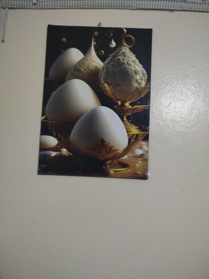 A poster hangs on a white wall, depicting four white eggs placed in golden bowls