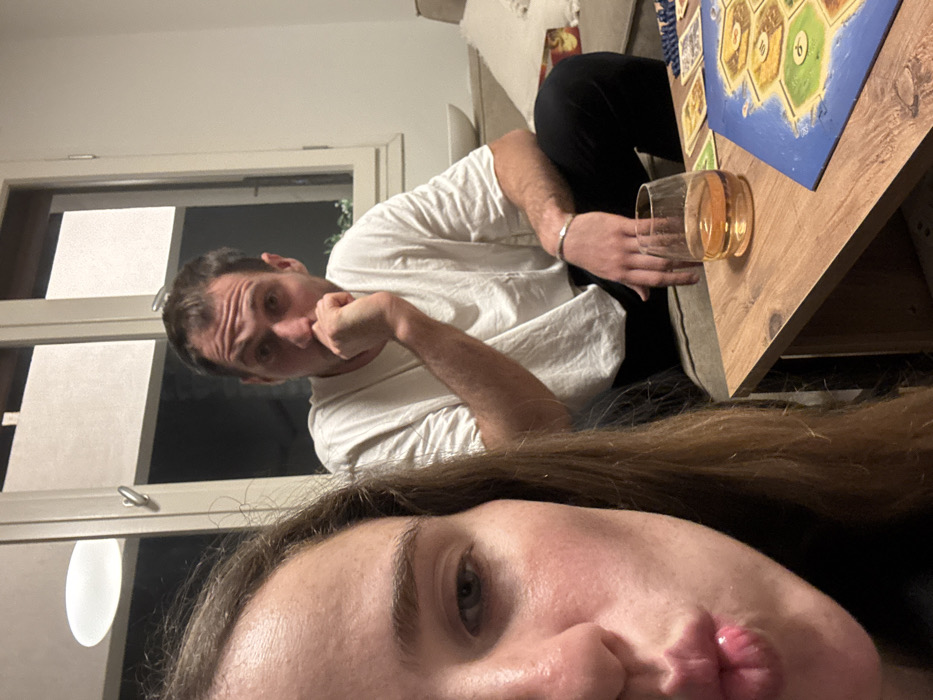 An indoor scene, likely a living room, is captured at night under artificial lighting. In the immediate foreground, the left side of a female's face, cropped, displays long brown hair. Her lips are intentionally puckered, and her partially visible right eye is directed towards the camera, indicating a self-portrait. Behind her, a male with short, dark, receding hair is seated on a light-colored fabric couch. He wears a loose white short-sleeved t-shirt and dark trousers. His left hand is raised to his chin, with fingers positioned near his mouth, suggesting contemplation. A silver bracelet is visible on his right wrist. On a light-toned wooden coffee table positioned in front of the male, a clear stemless glass contains an amber-colored liquid. A board game, identifiable as "Catan" by its hexagonal terrain tiles and associated playing cards, is partially spread on the table. The background reveals a window with white frames and partially drawn white blinds. An oval-shaped, white ceiling light fixture is visible in the upper left. The interior lighting suggests an evening or nighttime setting. No specific visual identifiers within the image confirm the requested location of Tel Aviv, Israel.