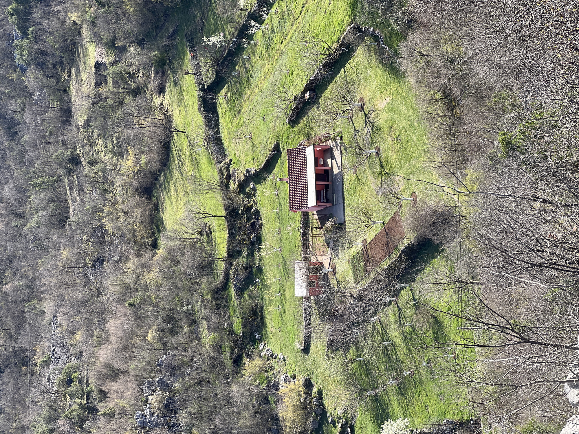 An elevated, high-angle view depicts a rural landscape in Gornja Brova, Montenegro, under bright daylight conditions. The central feature is a small, single-story residential structure with light-colored walls and a terracotta-tiled, gabled roof, centered within a manicured green area. A red-brick chimney is visible on the roof's peak. A concrete patio extends from the front of the house, supporting a picnic table with benches. To the northwest of the main house, a smaller, rectangular outbuilding with reddish-brown walls and a light-colored, pitched roof is present. The immediate surroundings of the structures consist of vibrant green grass intercut with numerous deciduous fruit trees, many displaying whitewashed trunks, arranged in an orchard configuration. A rectangular patch of dark brown, tilled earth, indicative of a garden plot, is situated among these trees. Winding, low dry-stone walls delineate property boundaries and terraced sections within the green areas. Beyond the cultivated plots, the terrain rises into dense, deciduous forest, primarily composed of bare-branched trees, suggesting late winter or early spring. Scattered rock formations are visible within the forested areas. No individuals, animals, or active interactions are observed within the frame. A faint utility line traverses the upper-right forested section.
