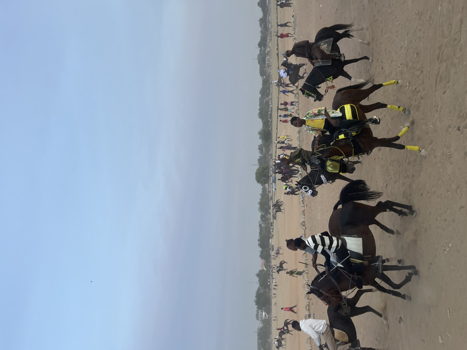 A dynamic scene unfolds with multiple horses and their riders engaged in a race. The jockeys wear varied attire, from traditional robes to striped shirts. The horses are diverse in color, including brown and black. A crowd of spectators lines the track, creating a vibrant backdrop. The atmosphere suggests an outdoor event, possibly a sporting competition, with a sandy or dirt track.