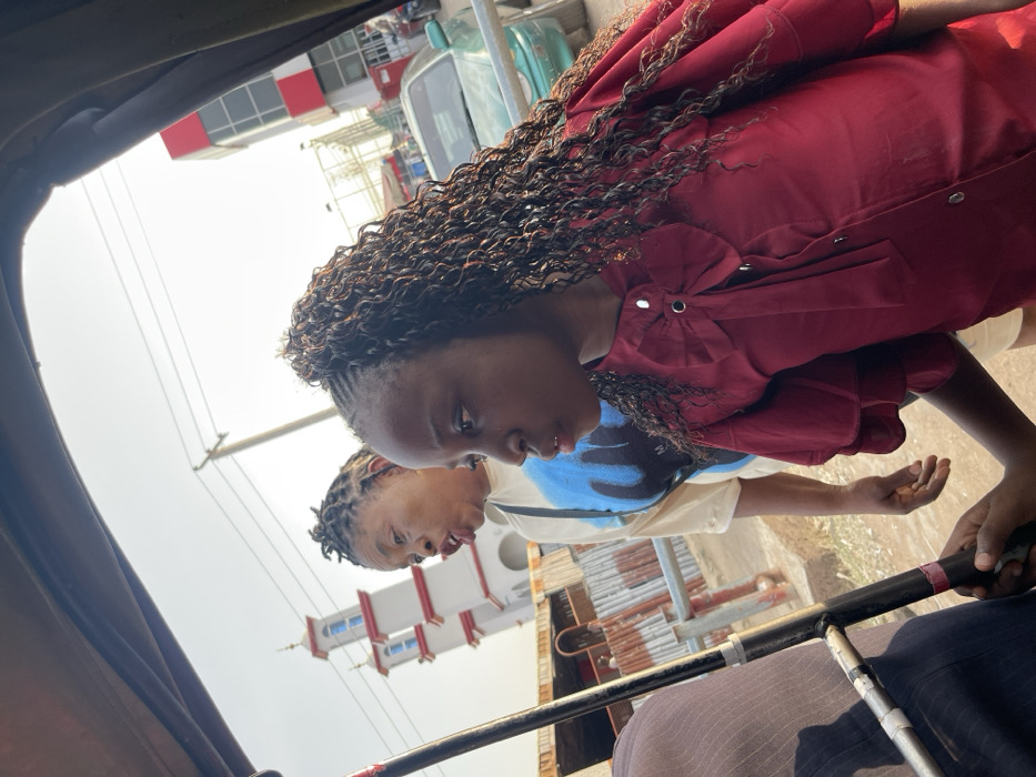 Two women are visible from inside a vehicle. The closer woman wears a burgundy shirt with decorative buttons and has braided hair. The second woman, slightly behind, wears a light-colored top with a blue and white design and also has braided hair. The background shows an exterior scene with buildings and utility poles, seen through the vehicle's windows. The interior of the vehicle shows metal bars and a seat with dark fabric.